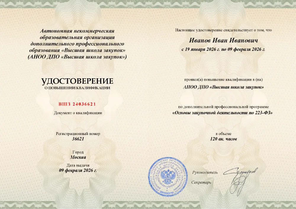 Повышение квалификации для участников закупок (по ст. 38 44-ФЗ) – не менее 40 академических часов (обычно 5–7 дней).